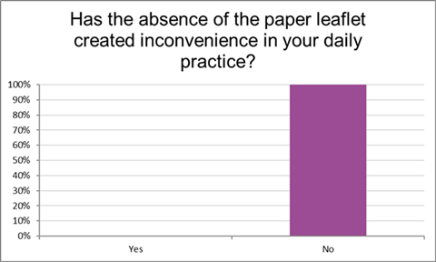 Overall, the results illustrated that the absence of the paper PIL in the medicine packaging did not cause any inconvenience to the daily work of the pharmacist, and was even found to ease the burden of the pharmacists’ daily work. Moreover, the pilot revealed that the absence of the paper PIL did not cause any inconvenience for physicians or nurses in the hospital setting. The results also demonstrated that direct requests from patients to consult the PIL for their medications in the hospital setting were very rare.