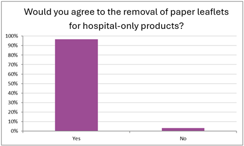 Consequently, 97% of the responding pharmacists felt that they would agree to the paper PIL being removed from the packaging of the medicines restricted to hospital use (with no ambulatory delivery/use) (Figure 5).